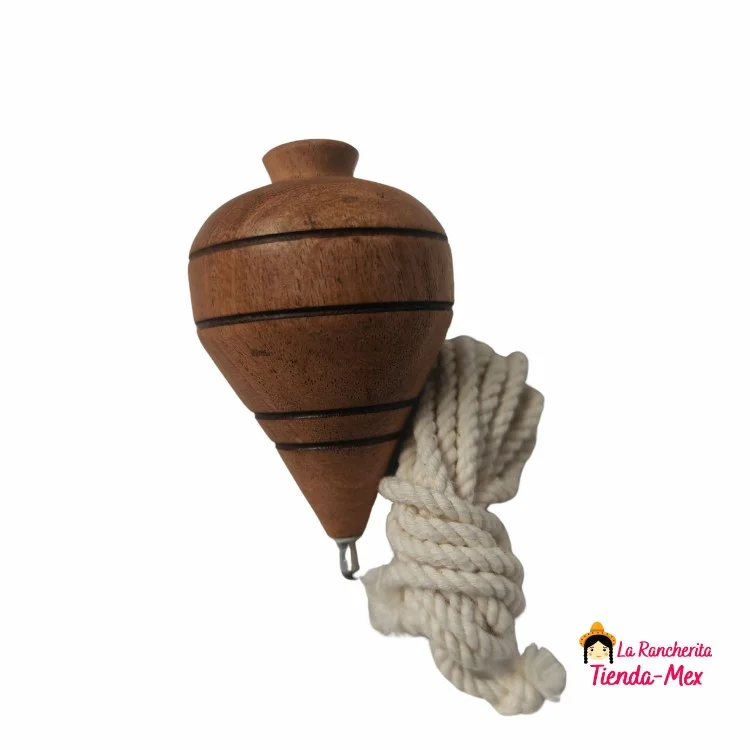 Trompo tradicional mexicano elaborado en madera tallada y recubierto con una capa de resina transparente que protege su acabado y resalta sus colores. Un artículo representativo de la cultura popular mexicana, ideal como juguete o recuerdo artesanal.