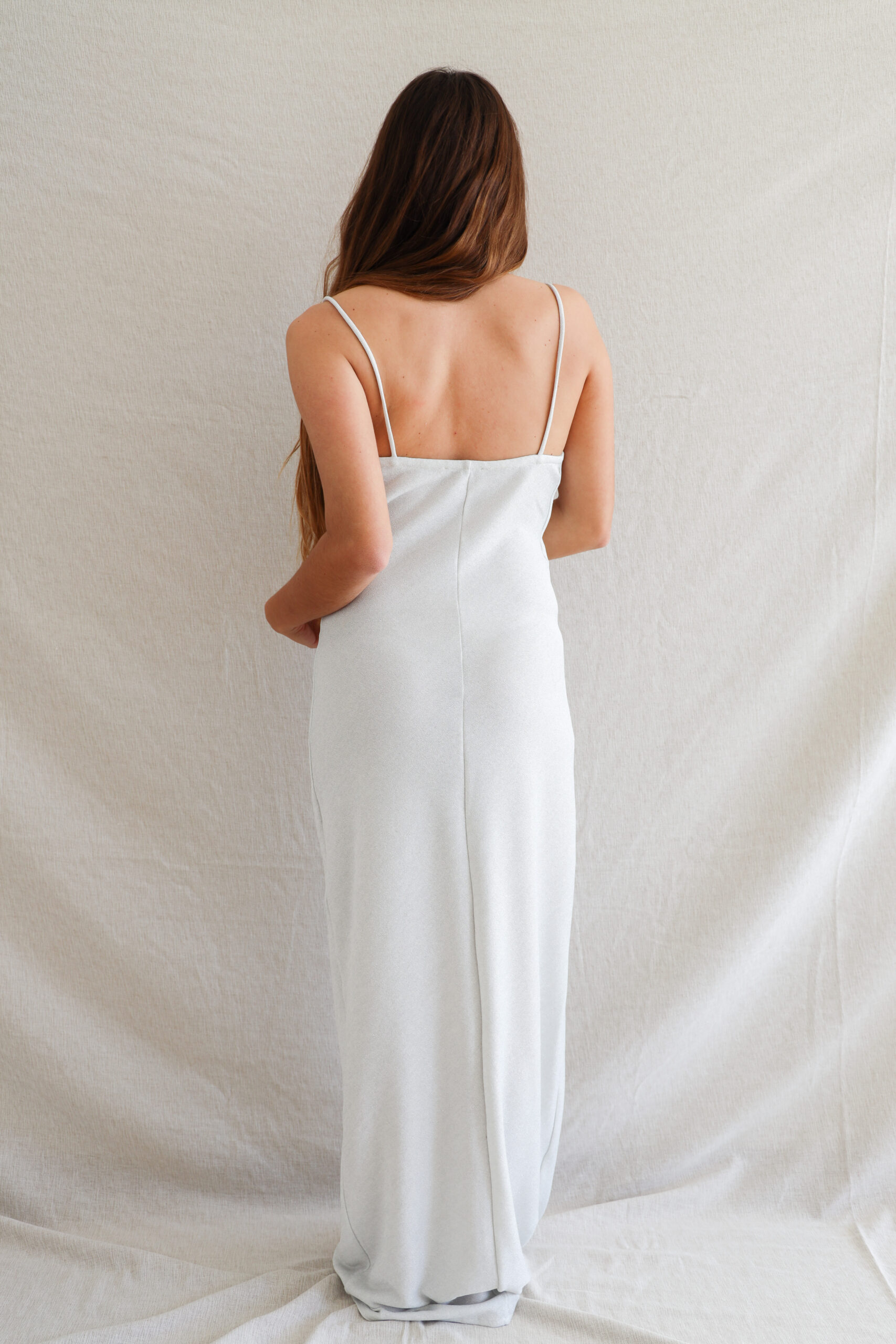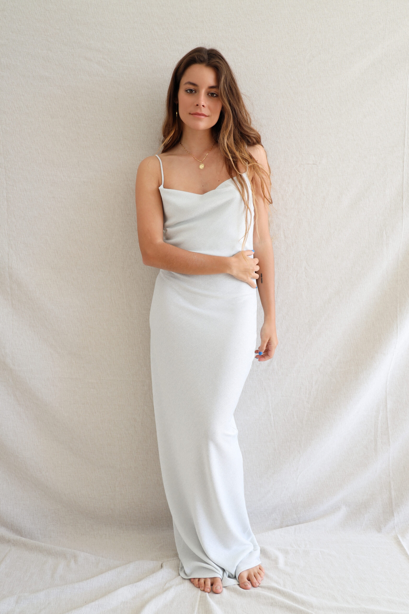 Vestido largo con escote en cascada.