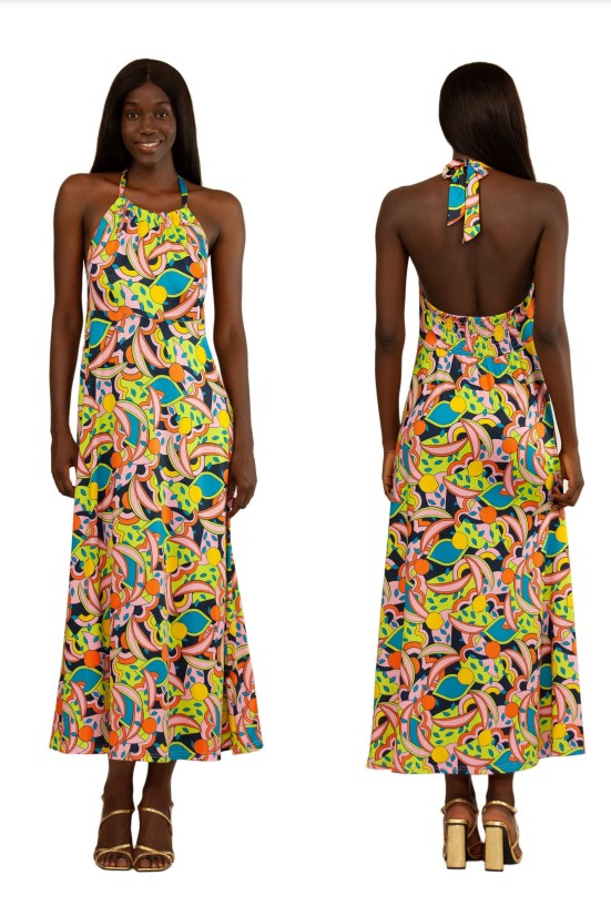 Vestido midi, anudado al cuello, con estampado psicodélico multicolor.