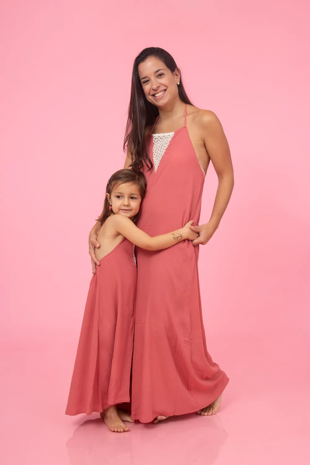 Salida de playa estilo vestido largo de color coral, con encaje adelante y espalda abierta.*Se puede hacer un lindo match con mamá-hija!