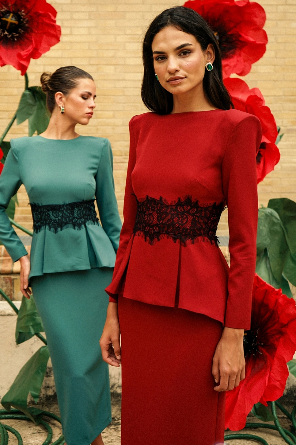 Péplum plisado con detalle de encaje en la cintura.