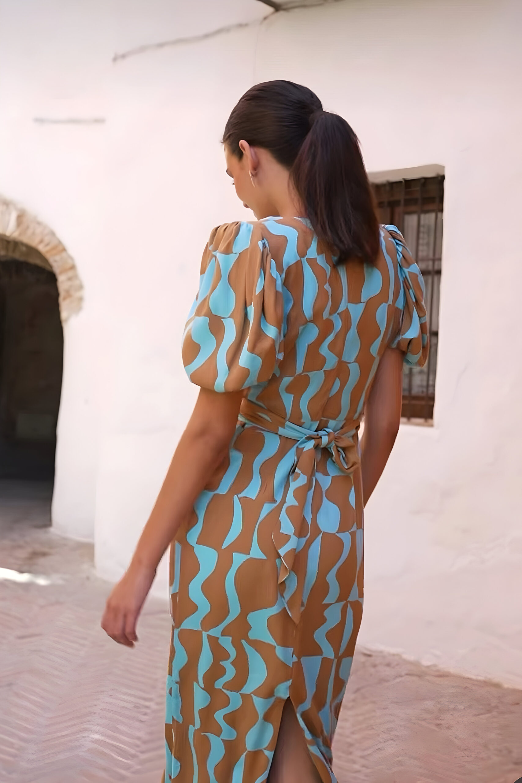 Escote de pico, espalda cerrada, preciosas mangas abullonadas y pequeñas aberturas en ambos costados que pueden taparse con la tira delantera para anudar de varias formas.
