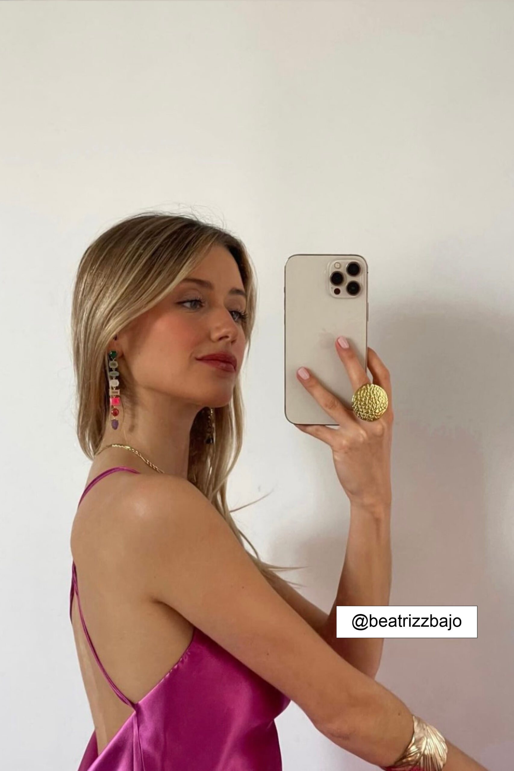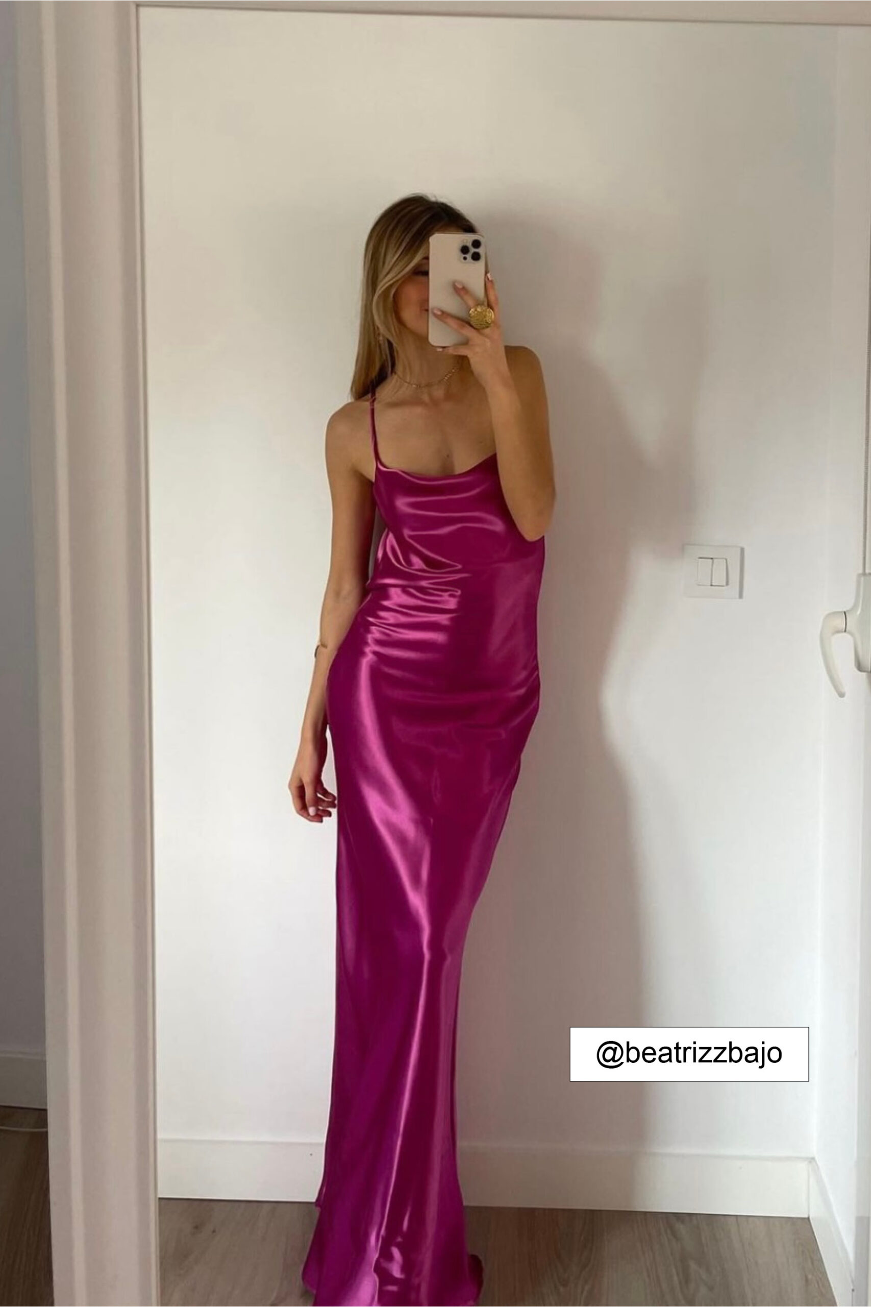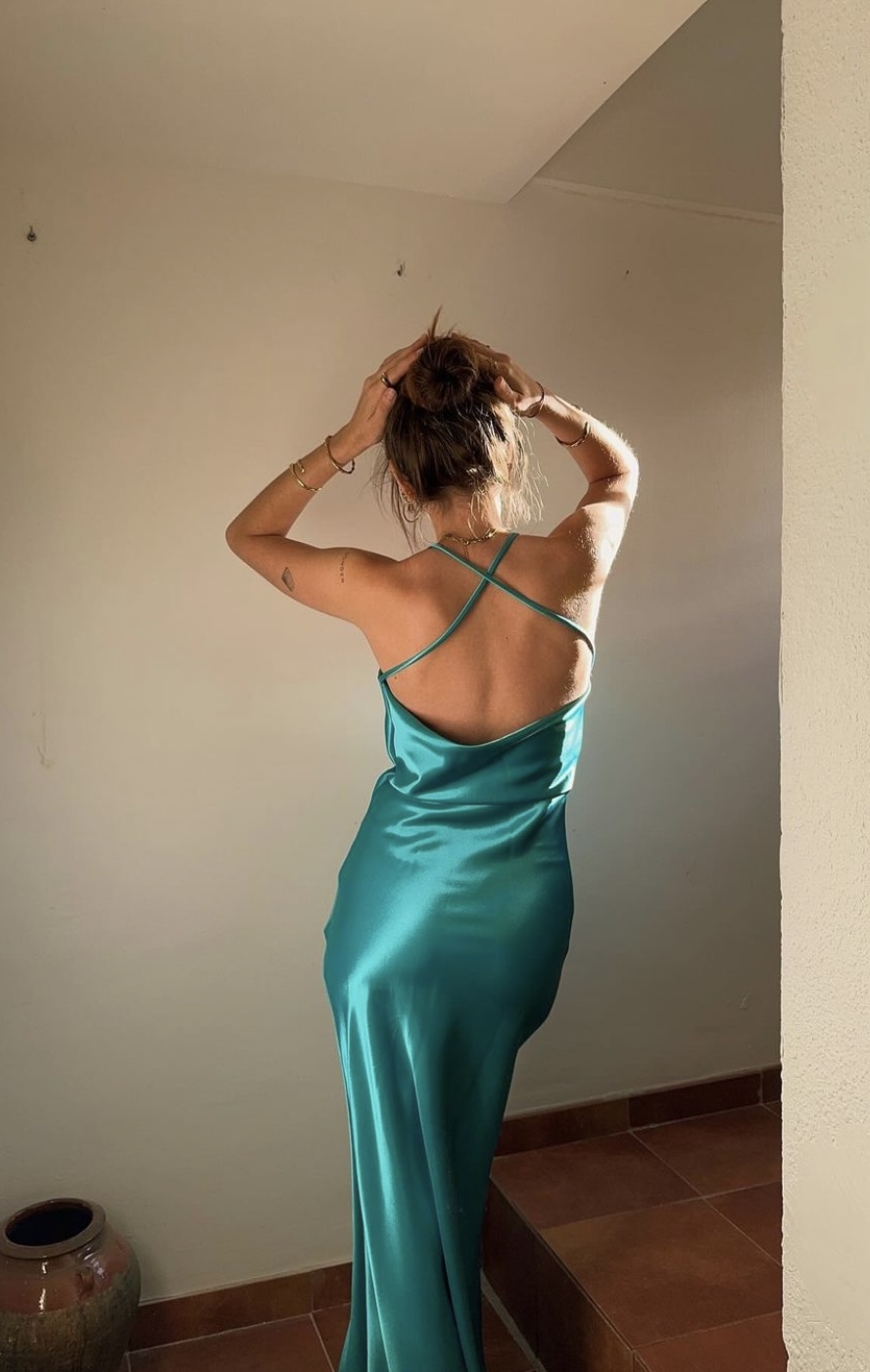 Vestido largo de tirantes entallado con escote de cascada y espalda cruzada.