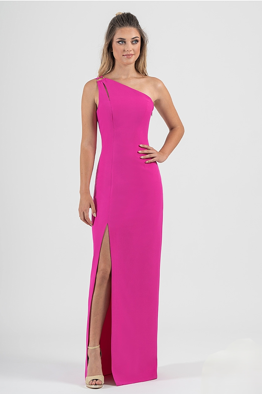 Corte entallado, escote asimétrico con tirante y anilla y espectacular raja lateral.